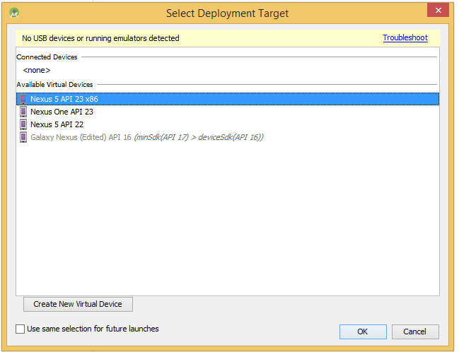 If anything else than the window above appears, please press "cancel" and wait a few more seconds that it finishes loading. Select an already pre-existing virtual device, else click on Create New Virtual Device and follow the steps. IT should take about 2 minutes to compile the code and launch an emulator for you to preview. The generated APK is now located under almondbird/Android/Test/app/build/outputs/apk