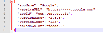 Picture Maker. Please note that using an apostrophe leads to the build failing sometimes. http://mydomain.com/path/to/mygame.php. This is the first thing the app will open. com.myappname.client. If you have no idea what this mean, simply replace "myappname" in the example by your app name without spaces or special characters. 1.3.7.122. It is for Google Play. Please note this number should increase, but you can also skip version numbers.#cc223a. It is going to be the color of the background of the splash screen when you launch the app, before it finished loading all the elements.Modify the content of the file to your liking, save and close the file.